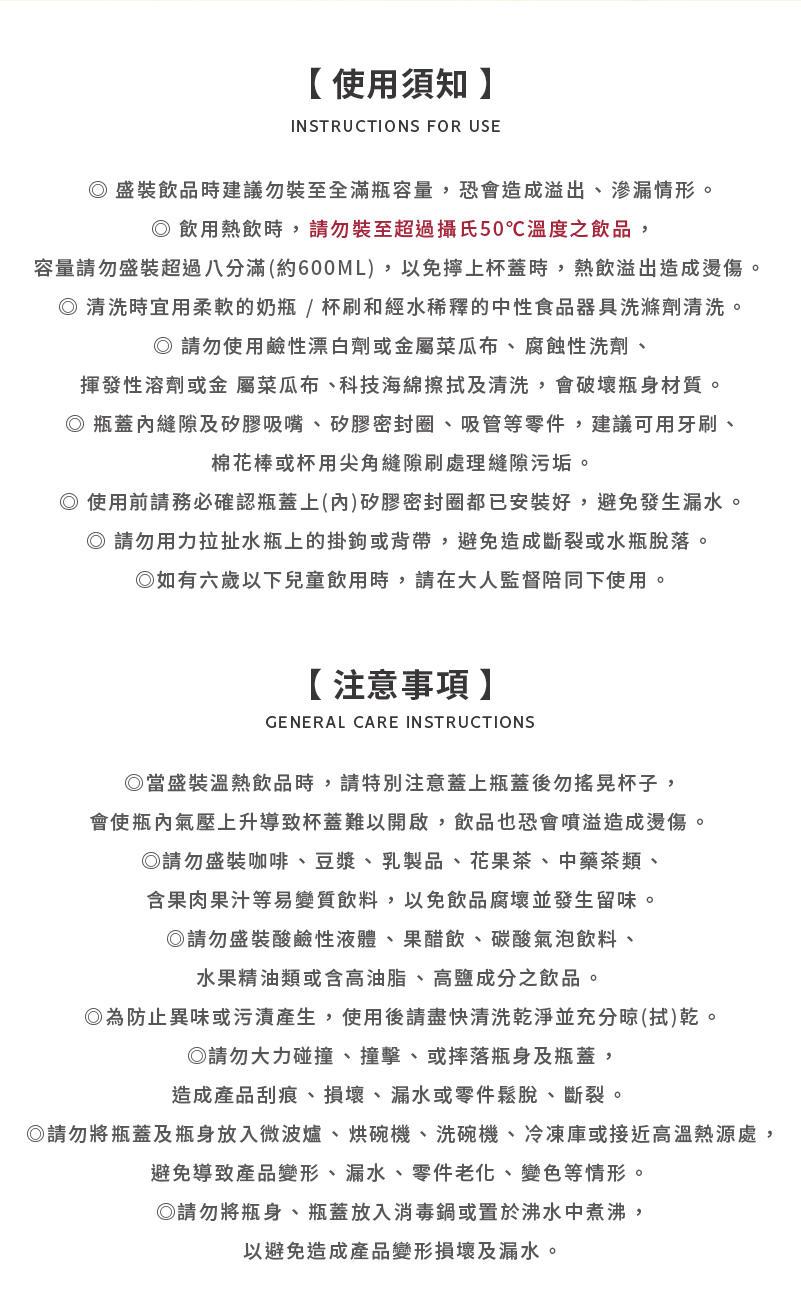 【耐溫】勿盛裝超過50℃熱飲